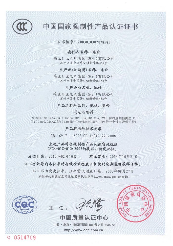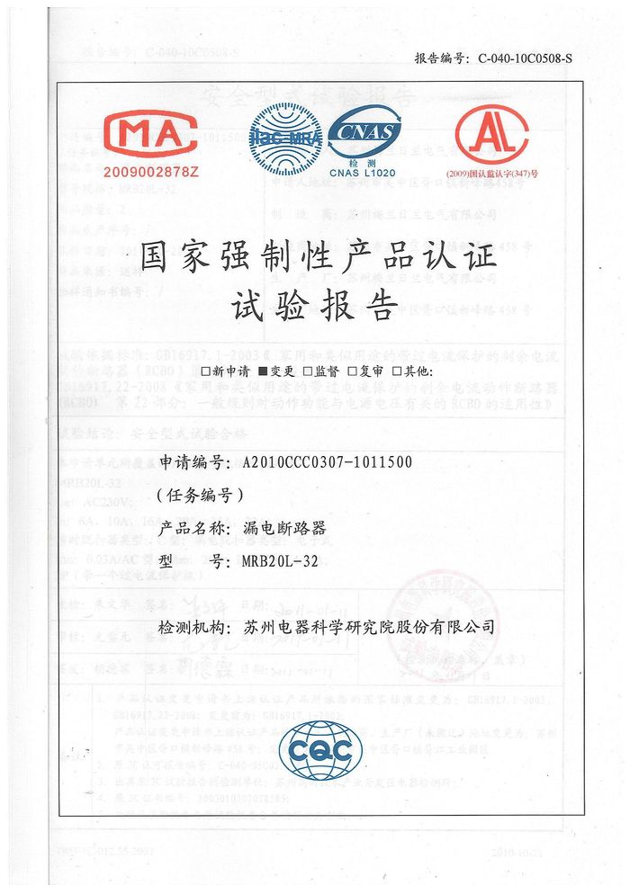 MRB20L-32漏電斷路器資質(zhì)證書