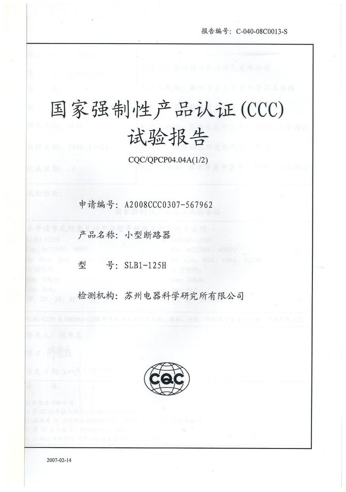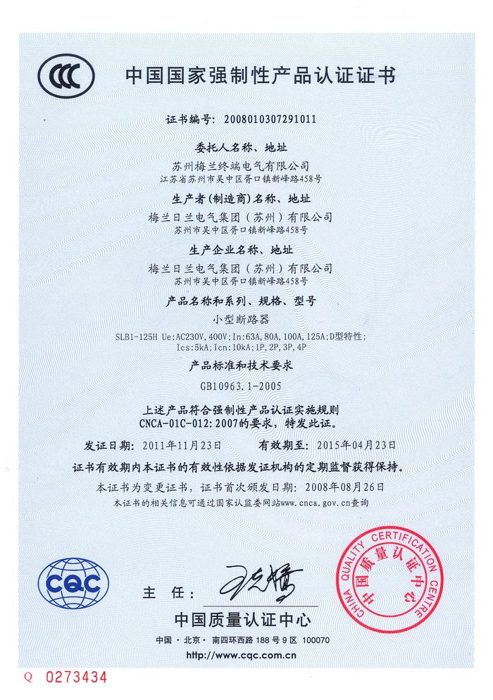 SLB1-125H小型斷路器資質(zhì)證書(shū)