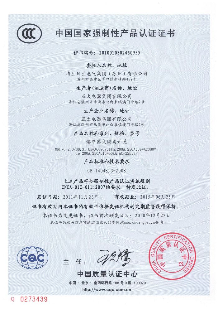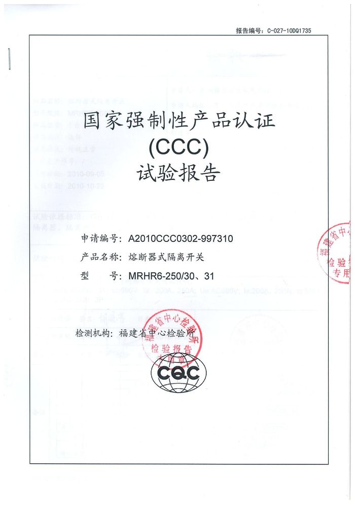 MRHR6-250熔斷隔離開關資質證書