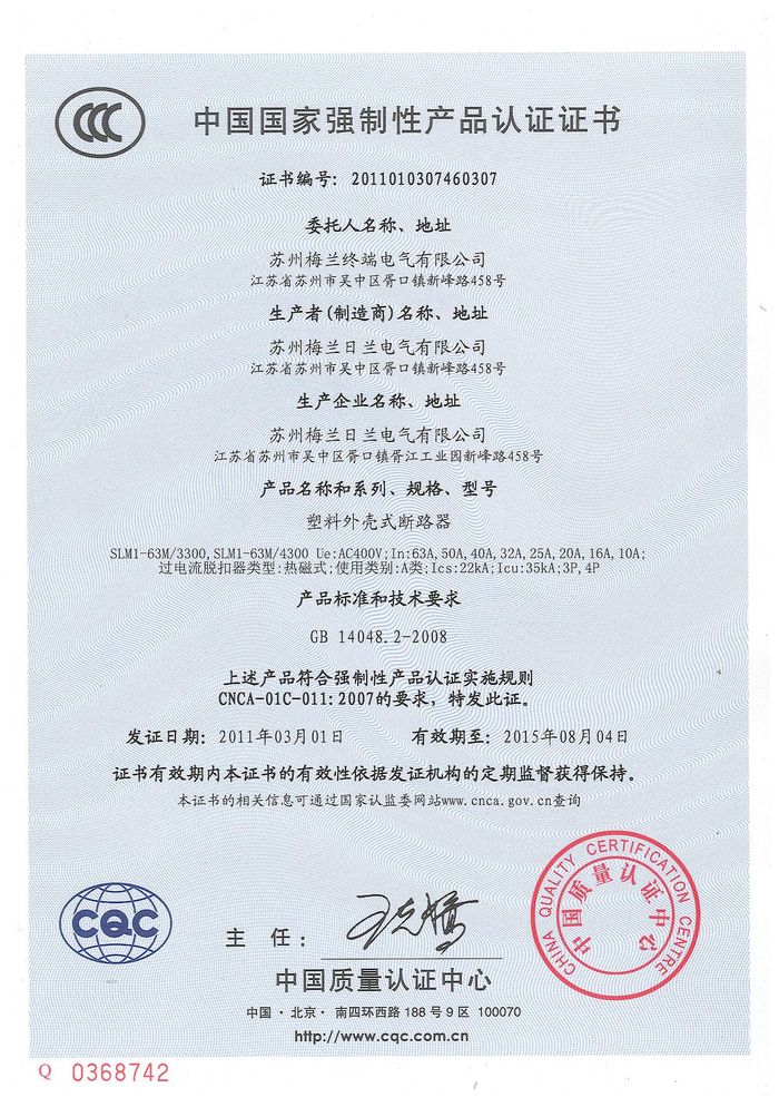 SLM1-63M塑殼斷路器資質(zhì)證書