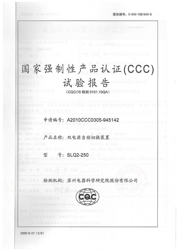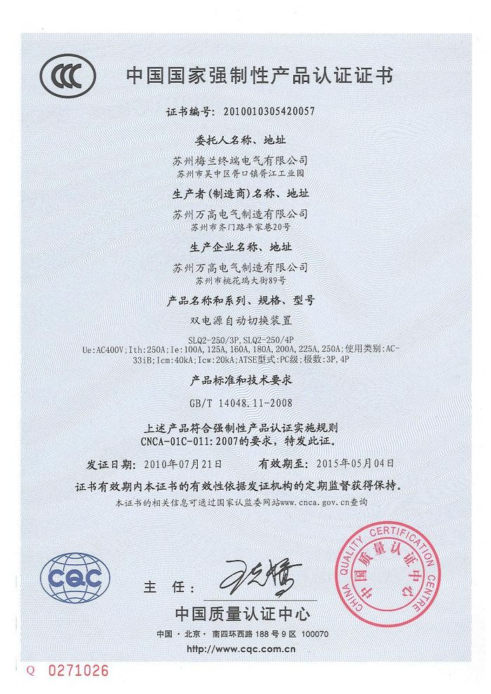 SLQ2-250雙電源資質(zhì)證書(shū)