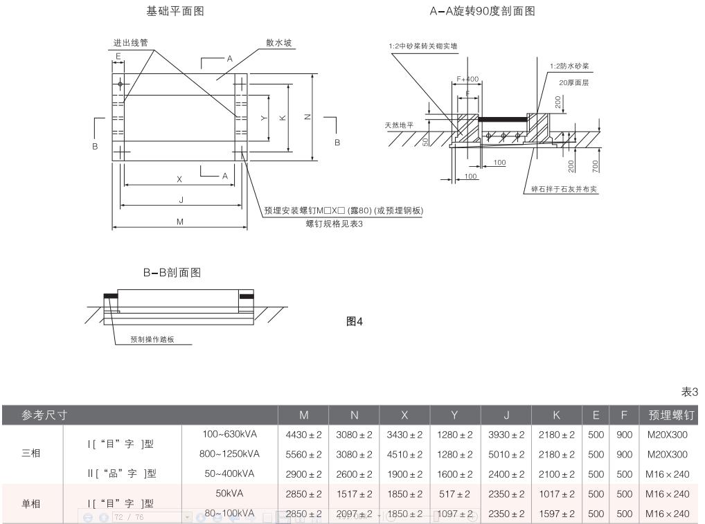 ◆用戶應(yīng)按提供的基礎(chǔ)圖做好箱變攀礎(chǔ),將箱變安置在基礎(chǔ)上后(箱變底部有四個(gè)安裝孔),調(diào)整平面。壓緊地腳螺栓。連接接地體、安裝出線電纜(架空出線也可),按要求全面檢查和必要電氣試驗(yàn)后,即可通電使用。