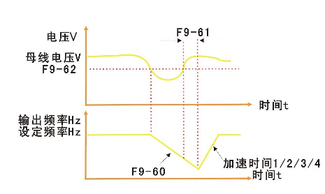 此功能指在瞬時(shí)停電時(shí)變頻器不會(huì)停機(jī),在瞬間停電或電壓突然降低的情況下,變頻器降低輸出速度,通過(guò)負(fù)載回饋能量,補(bǔ)償電壓的降低,以維持變頻器短時(shí)間內(nèi)繼續(xù)運(yùn)行。
