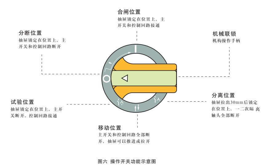 抽屜插入后,將手柄順時針方向轉(zhuǎn)動時,首先到達“試驗位置”(↓),此時機構(gòu)將外部電源引入控制回路,用戶通過面板上的安全電器(假如有的話)對電路進行試操作,以確認其是否符合要求,由于主開關尚處于斷開狀態(tài),因此一次回路處于無電狀態(tài),即使操作結(jié)果與要求不符也不會損壞設備,繼續(xù)順時針方向轉(zhuǎn)動到手柄處于水平位置時,即“分斷位置”(0)。此時一次和二次回路均處于無電狀態(tài),沿順時針方向繼續(xù)旋轉(zhuǎn)90°則手柄轉(zhuǎn)到“合閘位置”(I),見圖六。