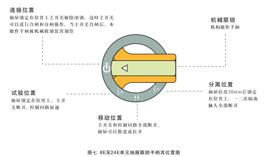 小手柄的操作及其位置定義與8E/4, 8E/2單元操作于柄基本相同,唯一沒有“斷開位置”而代之以“連接位置(↓)。只有當手柄處于此位置時,才可操作主開關操作手柄(大手柄)。大手柄指示箭頭橫向左側(cè)時為“分斷位置’,此時一次和二次電路處于無電狀態(tài),大手柄順時針轉(zhuǎn)動到指示箭頭向上時為“合閘位置”,主開關合閘。小手柄和大手柄的操作有嚴格的機械聯(lián)鎖,不能隨意操作,更不能硬扳死撬。注意:只有小手柄處在“連接位置”時,大手柄才能進行合閘操作;同時只有大手柄處在“分斷位置,時,小于柄方能轉(zhuǎn)動。有時大手柄雖也處在“分斷位置’但定位不準,這會造成小手柄不能轉(zhuǎn)動或轉(zhuǎn)動不到位,此時千萬不可硬扳,應再稍轉(zhuǎn)動大手柄使之準確到位即可。